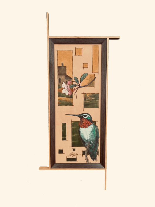 Burnt Leather Designs, Dyed Fragmented Background Scenes, Hummingbird And Cherry Blossom In Acrylic, and A Cherry Wood Frame Accented With Wenge